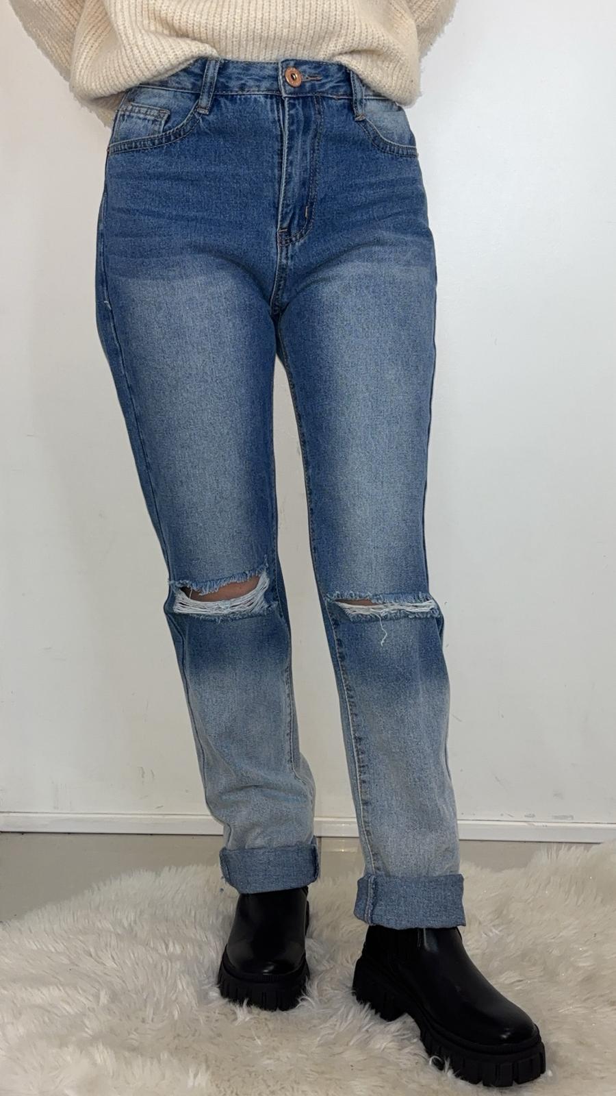 Jean bleu clair déchiré aux genoux